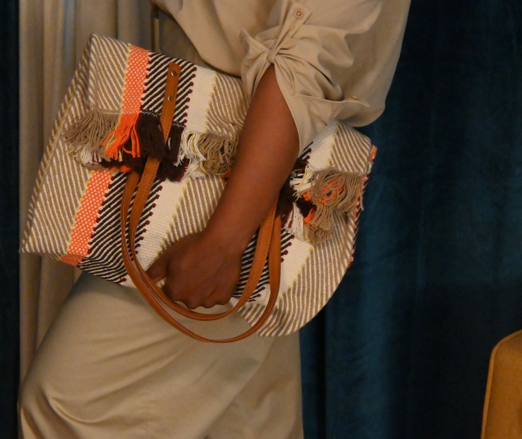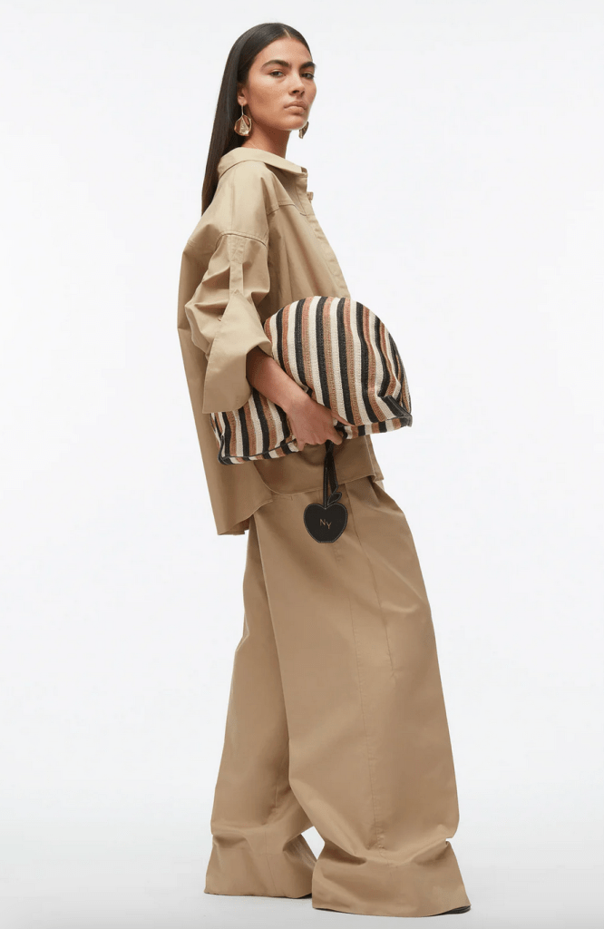 An understated woven tote grounds the ensemble with tactile warmth. This striped version from Jen & Co. brings in just enough pattern to add interest, without distracting from the minimalist silhouette. It’s functional, neutral, and quietly modern.