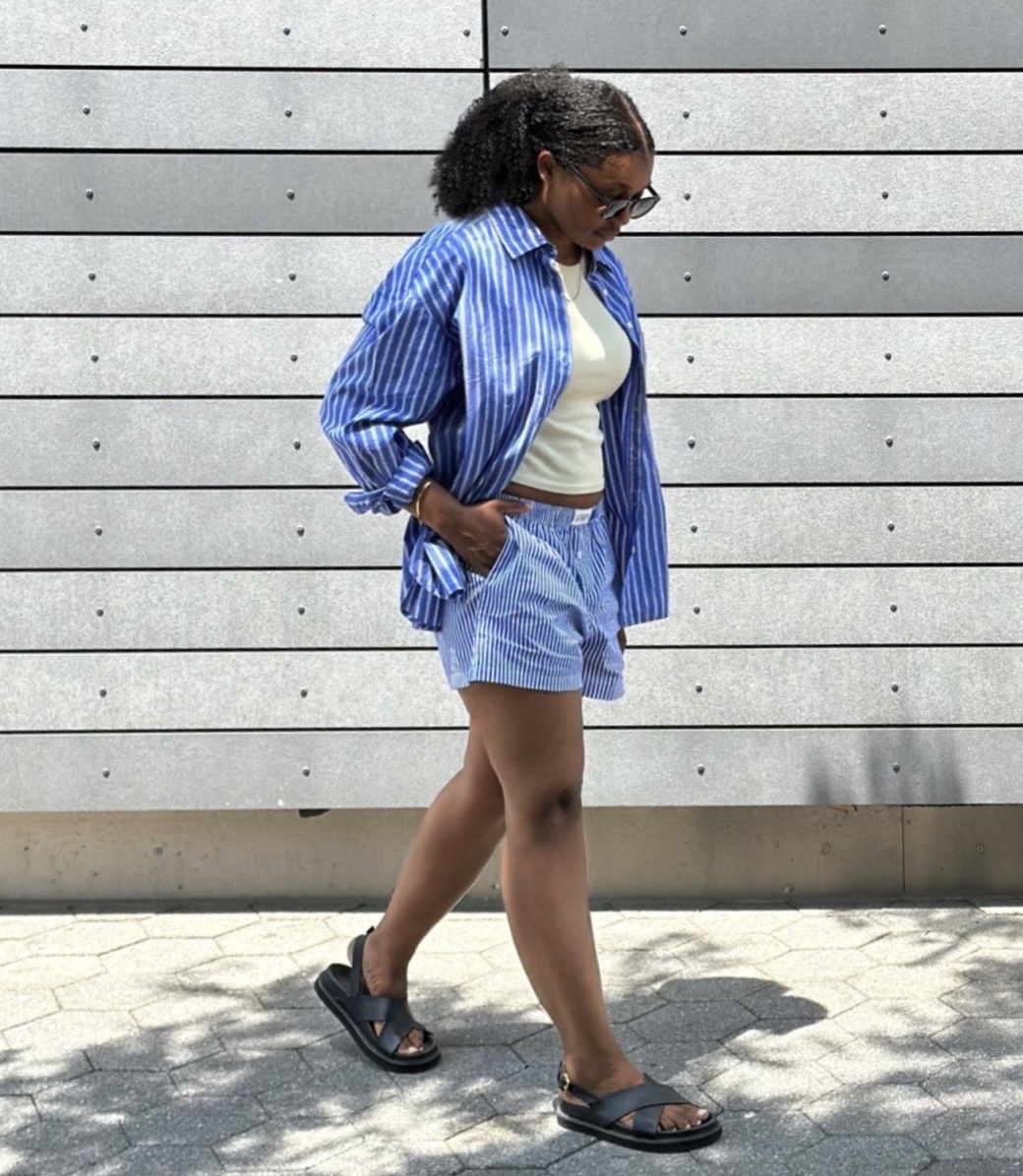 Sets are great, but they’re even better when you treat them like a styling playground. I wore the striped shirt open over a neutral fitted tank, rolled the sleeves and paired it with shorts, which gave the vibe of “accidentally put-together,” which we all know is never actually accidental. Quick tip: In cooler weather, you can layer under a long trench for added dimension.