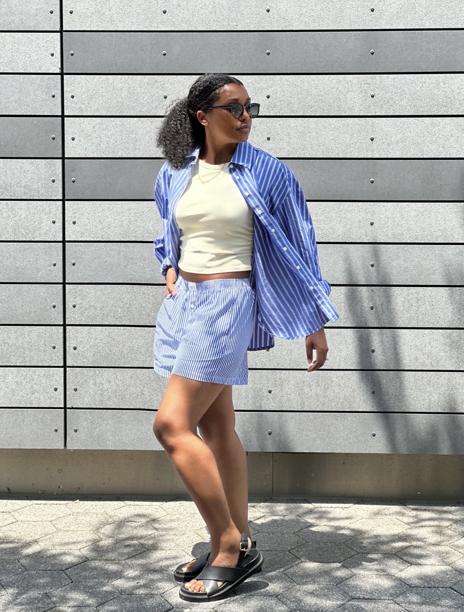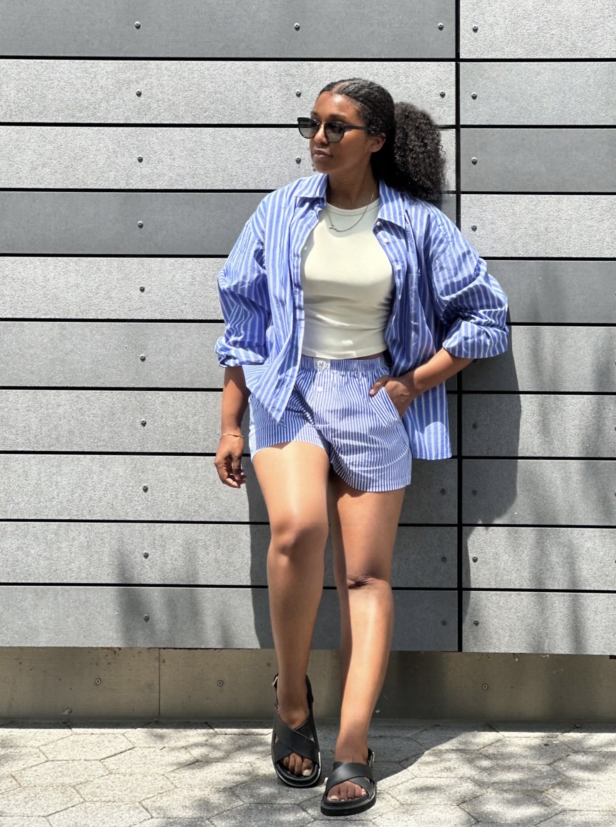 I’ve found there’s power in embracing proportion. Instead of reaching for a tailored top to match my mid-thigh poplin shorts, I went the opposite direction: a full, oversized striped shirt with exaggerated cuffs and a slightly boxy shape. At first, I thought it might drown me out, but I left it unbuttoned and rolled the sleeves up to give the look movement and intent. That unexpected volume-on-volume pairing actually made the outfit feel more modern. It didn’t need to be cinched or tucked tight. It just needed to look like I chose it, not like I defaulted to it.