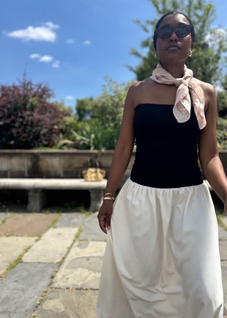 With the waistline sitting lower than usual, there’s a natural elongation of the torso. To counterbalance that, I aimed to draw the eye upward by accessorizing with a silk neck scarf for a more refined look but this can also be done with a lightweight denim jacket or knit layered over the dress for a casual take. These additions add polish and restore proportion. Statement earrings or sunglasses with hair pulled back can help reframe the silhouette as well.