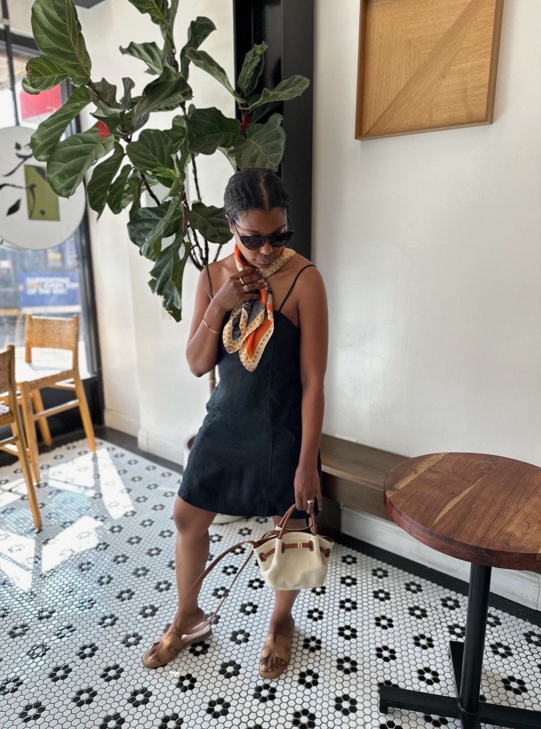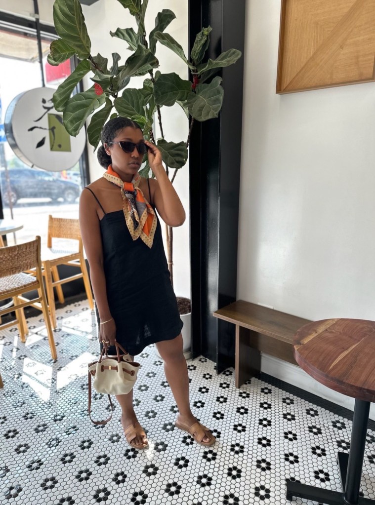 The linen mini is my go-to on those unbearably sweltering summer days. Far from the rustic simplicity often associated with linen, this version is all about precise tailoring and modern minimalism. Clean lines, elevated fabric weight, and a hem that hints at sophistication rather than playfulness make it a considered choice. It’s the kind of dress that speaks softly but with clarity and works every summer in tried and true neutral tones. I paired mine with neutral Steven New York Harlien flat sandals, JW Pei Hana mini tote and a neck scarf for a pop of color and contrasting texture. It’s giving elevated but with minimal effort (and fabric) for those scorching summer days.