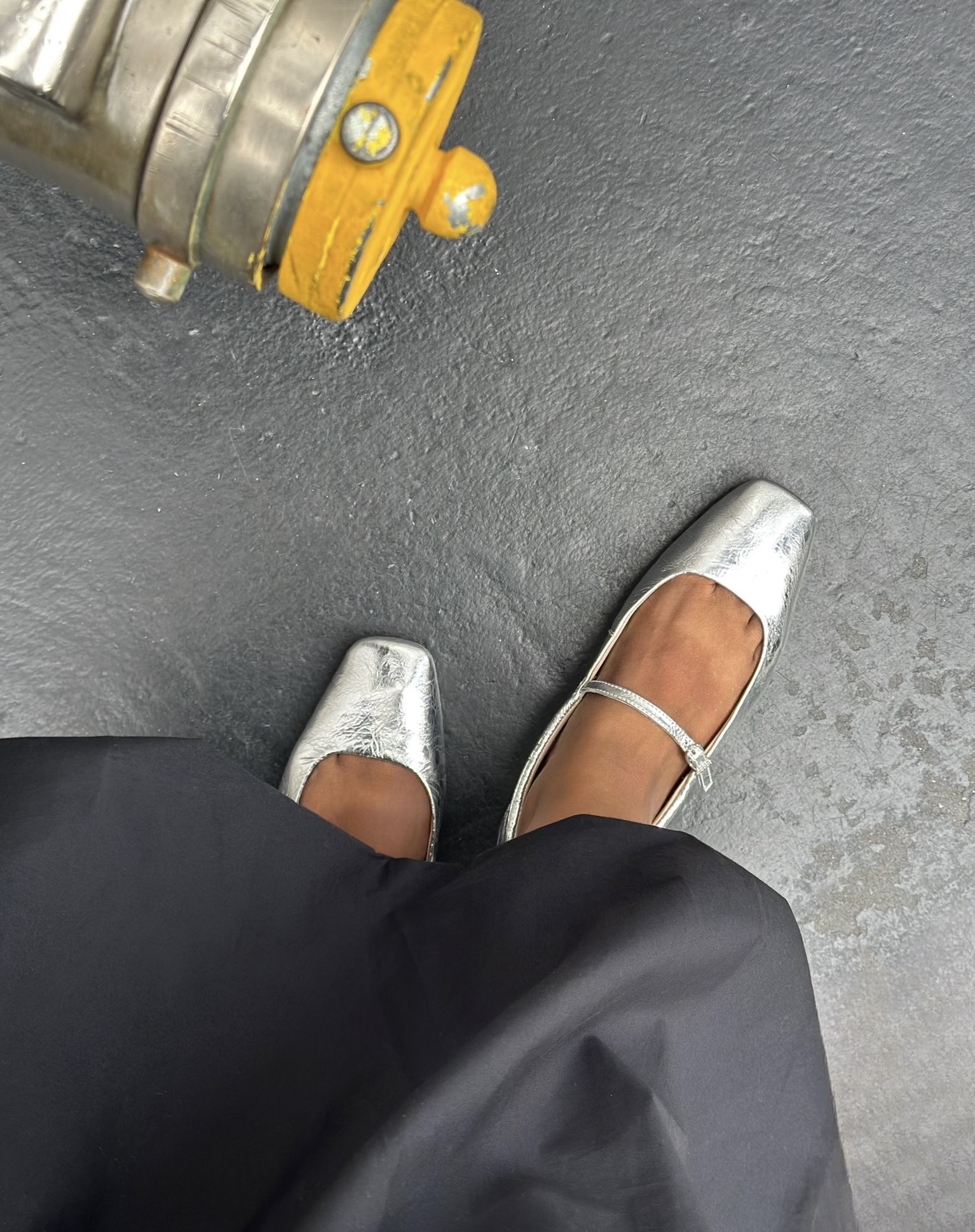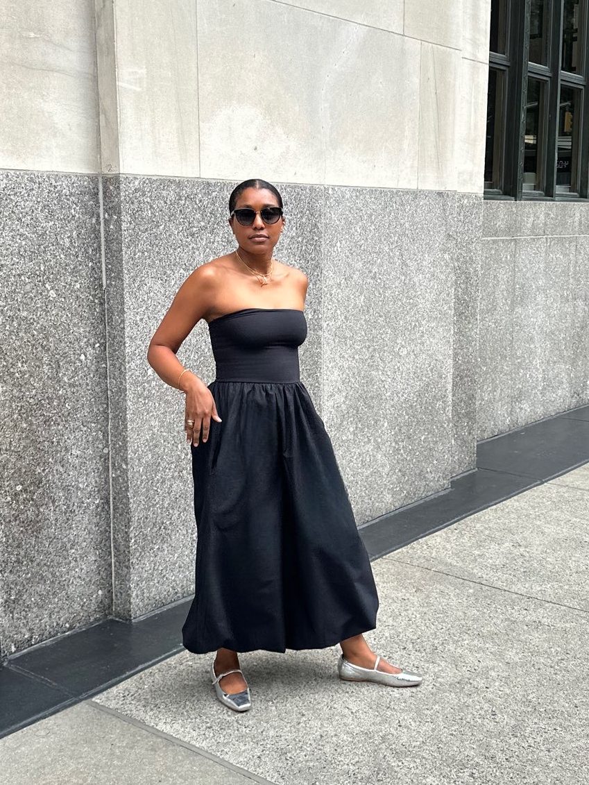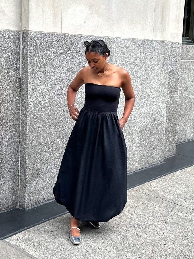 The bubble hem is a silhouette long associated with high-fashion volume and runway nostalgia because it brings a sculptural dimension that immediately sets an otherwise simple dress apart. And the strapless bodice of this look creates a clean, architectural line, while the midi length keeps it grounded and wearable. It’s an unexpected shape for daytime dressing, which is exactly the point. I let the silhouette do the talking and styled this look with more minimal accessories. I was so excited to take this dress around town, pairing it with mixed metallics in the form of a silver mary jane flat and silver and gold jewelry for contrast.