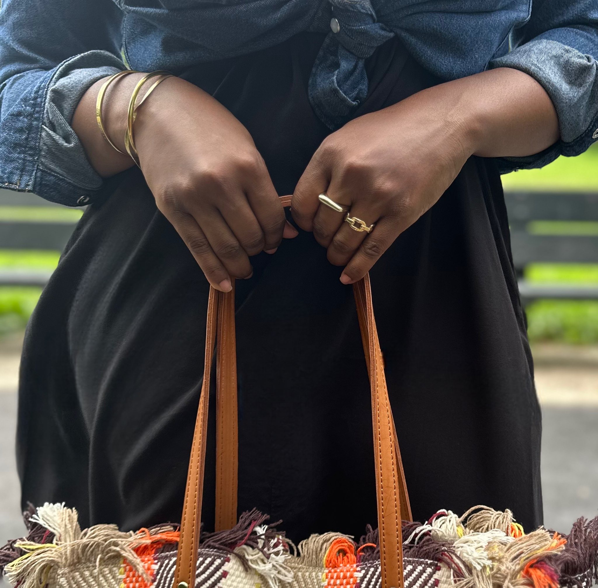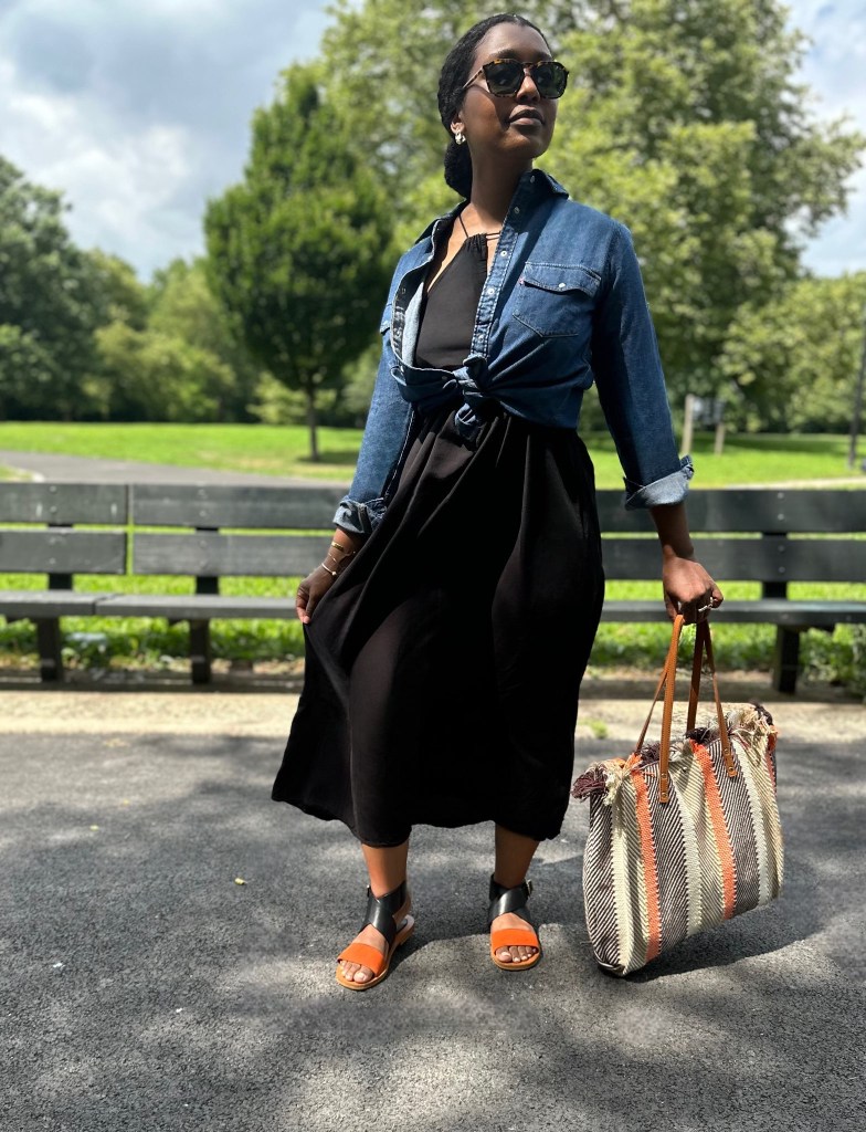 At first glance, the strappy smock dress may seem pared back but therein lies its power. It channels the sleek sensuality of ‘90s-era minimalism (a golden fashion era, IMO), but with the modern benefit of impeccable cut and fabric drape. The barely-there straps and liquid silhouette offer a whisper of glamour that feels intimate and this asymmetrical style is a more contemporary take. The best part of wearing this style is its lightweight nature that catches the breeze without compromising coverage on days when I don’t want to bear a lot of skin. And a simple addition of an open or tied button up or lightweight knit draped at the shoulders can provide some elevation with simple layering for this style. I finished my casual look off with a chunky Chloë Phoebe Philo era flat and fringe detail Jen & Co. Madison tote bag.