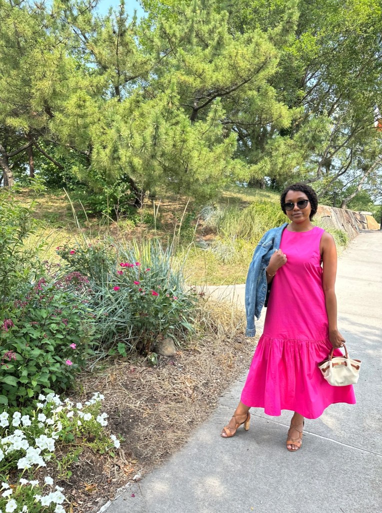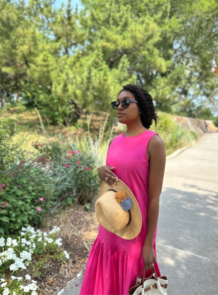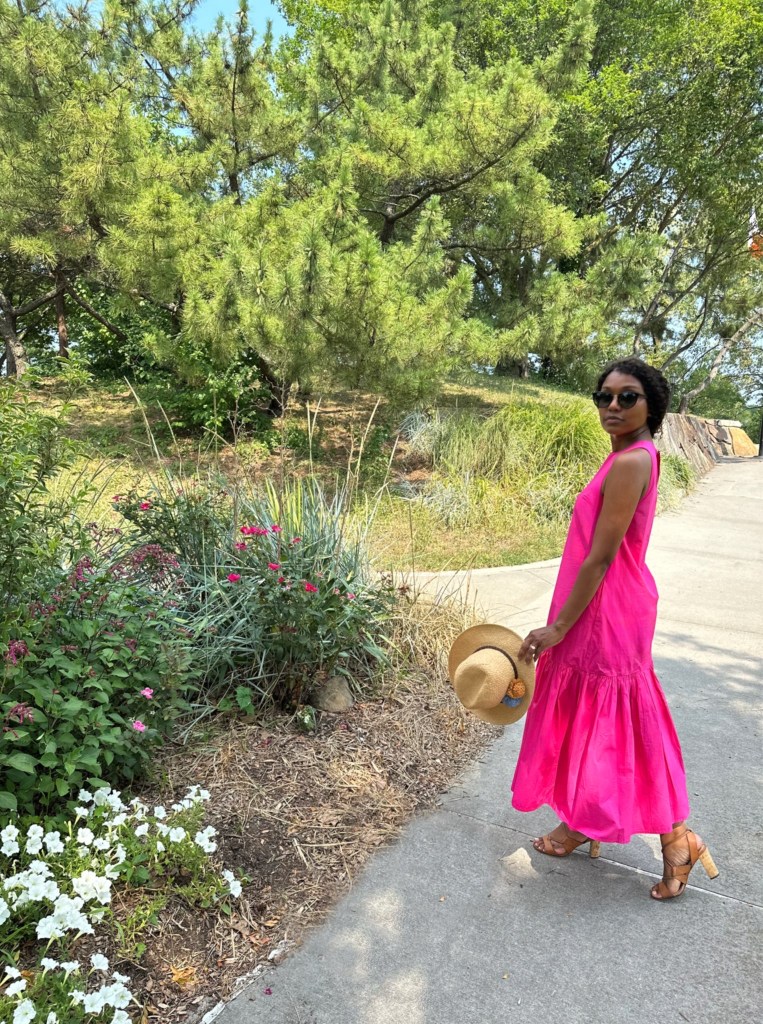 The tiered maxi dress is a bold commitment to volume and movement. It’s such a fun silhouette with just enough drama. The tiered structure creates a sense of fluidity with every step, lending the dress a sculptural softness that feels both relaxed and intentional. It really channels an undone elegance that works just as well for day as it does for dinner. It can liven up any closet with texture and, if you’re someone who leans more toward a neutral palette, like me, it adds an unexpected pop of color for a weekend getaway or summer vacation. I styled this hot pink tiered maxi with the JW Pei Hana mini tote and a woven Raffia fedora hat for balance as well as a pair of neutral leather Jimmy Choo Margo 80 heel sandals for added height and to lengthen the leg so as not to drown in the silhouette.
